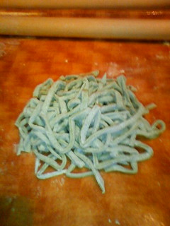 ワカメの粉が練り込んであるんで、緑色です。