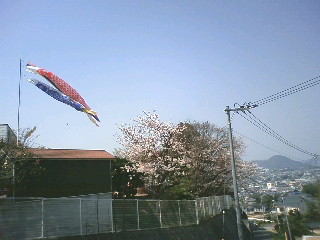 そして大きな鯉のぼりと満開の桜、眼下に広がる景色を見ながら書いてます。