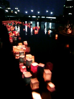 1枚目は川を流れる色とりどりの灯篭、2枚目は平和を願うキャンドルです。